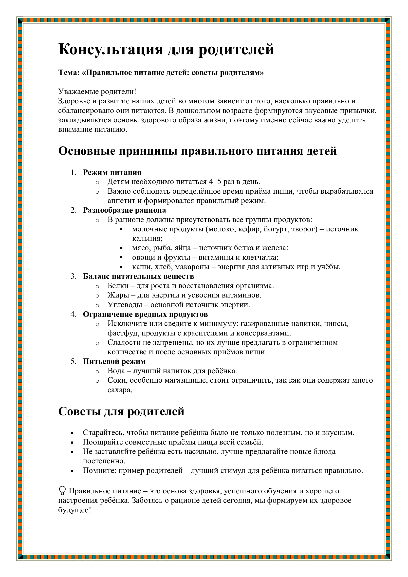 Консультация для родителей «Правильное питание детей: советы родителям»